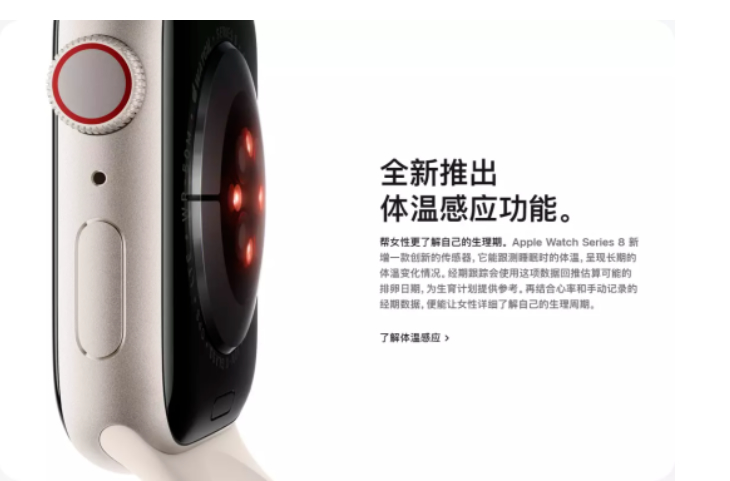 值得注意的是,这款手表搭载了全新的温度传感器,温度可以精确到0.1度,以查看用户的夜间提问及基线体温变化对比;借助两枚全新的温度传感器,能够自动对女性的排卵期进行测算预测